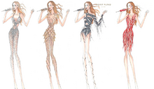 Lopez's wardrobe for the tour includes "a feathered skirt and lid, a one-piece, a cape, a bodysuit and several short dresses". On June 12, 2012, Murad unveiled the tour's first costume sketches. A "earlier and after" film, the starting time image depicted an "elaborate" ruby-red red robe on top of a shimmering dress, which was tied to Lopez's waste product, while the robe "drapes over her shoulders and then trails out".[21] The dress she was wearing, fully revealed in the second prototype, "features thousands of scarlet chaplet hand-sewn onto nude silk tulle in a flame pattern".[22] Murad was also reported, at the fourth dimension, to have been working on a bodysuit and several short frocks. Kristie Lau of the Daily Mail service said the outfits themselves "will no dubiety evidence show-stopping".[21] Overall, Murad created six new looks for Lopez'due south show. This included the elaborate reddish robe along with a plunging catsuit which Sarah Bull of Daily Mail said clung to her figure, as well as the featured skirt and hat, a jumpsuit and two capes among other looks.[xx] [23] Bull commented that the skintight catsuit "bursts of diamantes to conceal her modesty."[23]